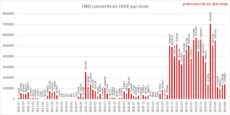 Ces graphiques montrent le nombre de HIVE effectivement utilisés par le processus de conversion (HIVE convertis + 5% de frais en HIVE qui sont détruits) chaque jour et chaque mois une fois que les demandes de conversion de HIVE en HBD ont été finalisées.