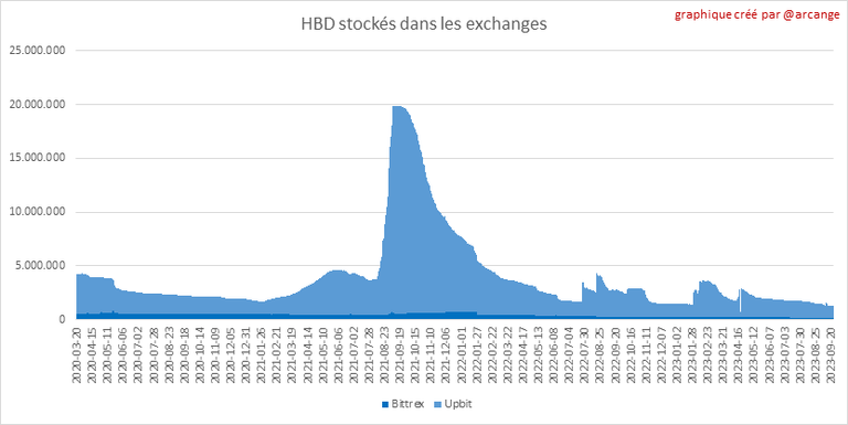 Ces graphiques montrent l'évolution journalière de HIVE et de HBD stockés dans les exchanges où ils sont cotés.