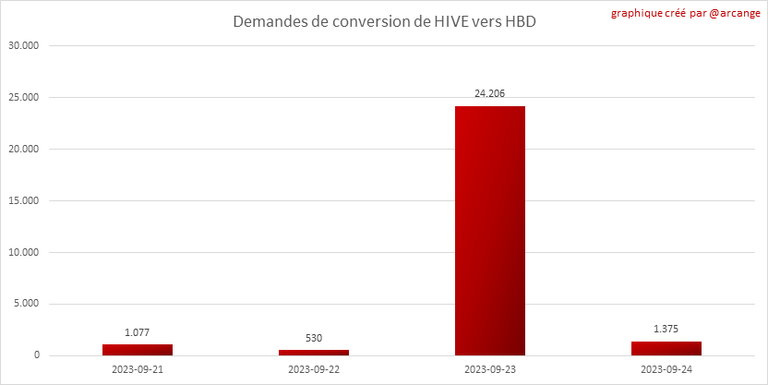 Note: Pour rappel, les demandes de conversion ne sont finalisées qu'au bout de 3 jours. Ce n'est qu'alors que l'on sait exactement combien de HIVE ont été détruits en contrepartie des HBD reçu lors de la demande de conversion.