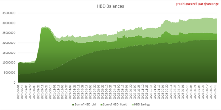 Ce graphique montre le nombre de HBD, liquides et en épargne, détenus par tous les comptes. Il montre également le nombre de HBD se trouvant dans le Decentralized Hive Fund (DHF).