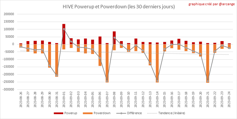 Ce graphique montre les Power-Up et Power-Down effectués au cours des 30 derniers jours et la variation qui en résulte. Le tableau montre les Power-Up et les Power-Down les plus élevées de la journée.