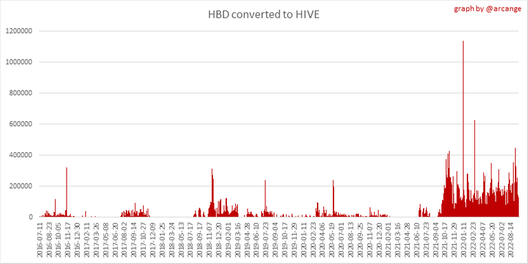 These graphs show the number of HIVE effectively used by the conversion process (HIVE converted and 5% HIVE fee which is burned) each day and month when requests to convert HIVE to HBD have been finalized.