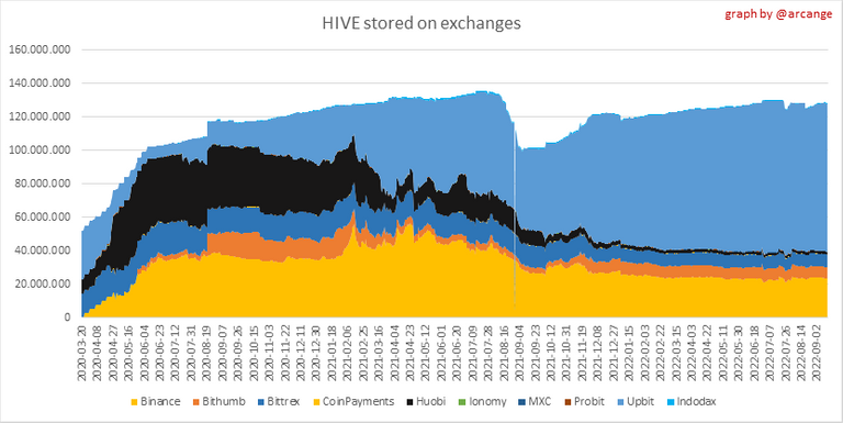 These graphs show the daily evolution of HIVE and HBD stored on the exchanges where they are listed.