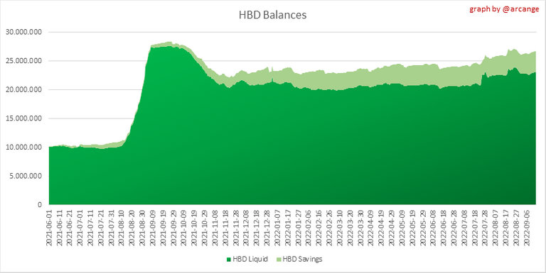This graph shows the number of HBD, both liquid and in savings, held by all accounts.