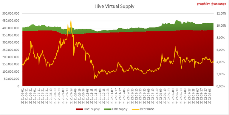 The graph also displays the debt ratio (HBD supply / HIVE virtual supply). Keep in mind that since hardfork 24 funds in the treasury (@hive.fund HBD balance) don't count towards the HBD debt ratio.