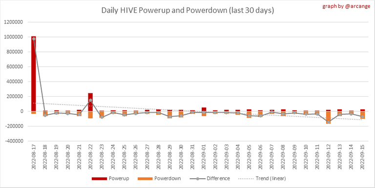 This graph shows the daily HIVE power-up, power-down, and the resulting variation over the last 30 days. The table shows the topmost power-ups and power-downs of the day.