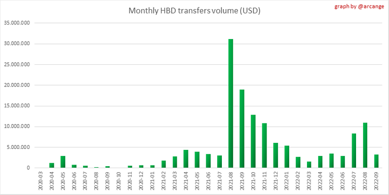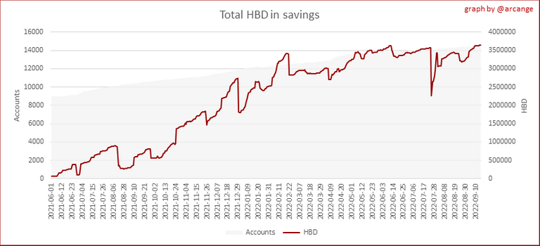 This chart shows the amount of interest paid each month for holding HBD and how many accounts received such interest.