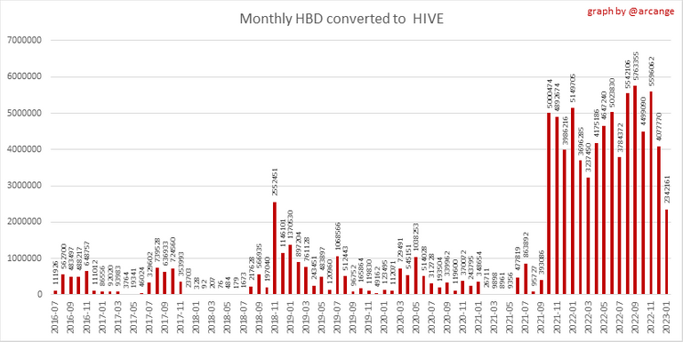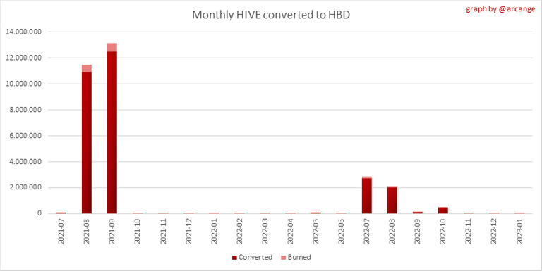 These graphs show the number of HIVE effectively used by the conversion process (HIVE converted and 5% HIVE fee which is burned) each day and month when requests to convert HIVE to HBD have been finalized.