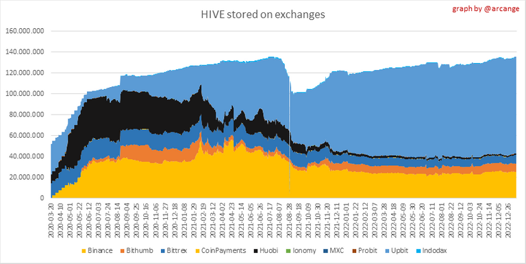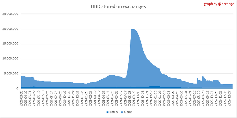 These graphs show the daily evolution of HIVE and HBD stored on the exchanges where they are listed.