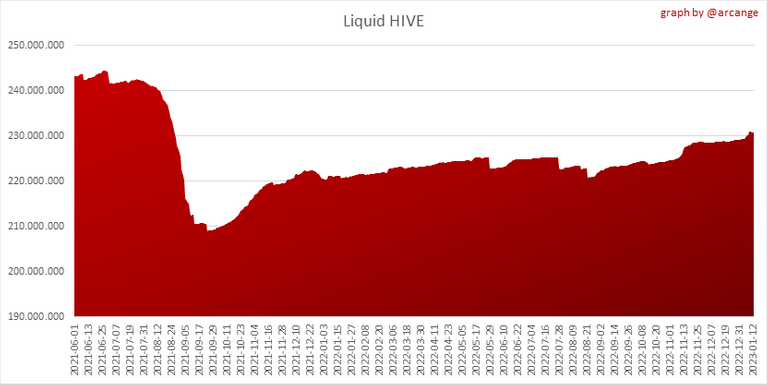 This graph shows the evolution of HIVE virtual Supply. The virtual supply is the sum of HIVE supply (liquid and staked HIVE) and HBD supply (converted into HIVE).