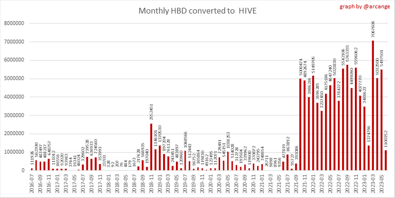 These graphs show the number of HIVE effectively used by the conversion process (HIVE converted and 5% HIVE fee which is burned) each day and month when requests to convert HIVE to HBD have been finalized.