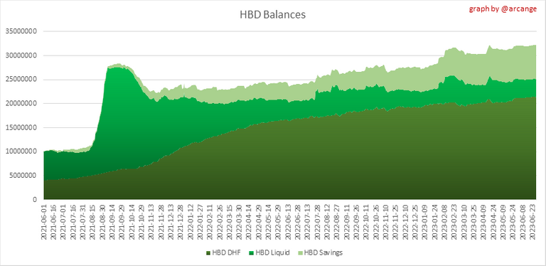 This graph shows the number of HBD, both liquid and in savings, held by all accounts. It also displays the amount of HBD stored in the Decentralized Hive Fund (DHF).
