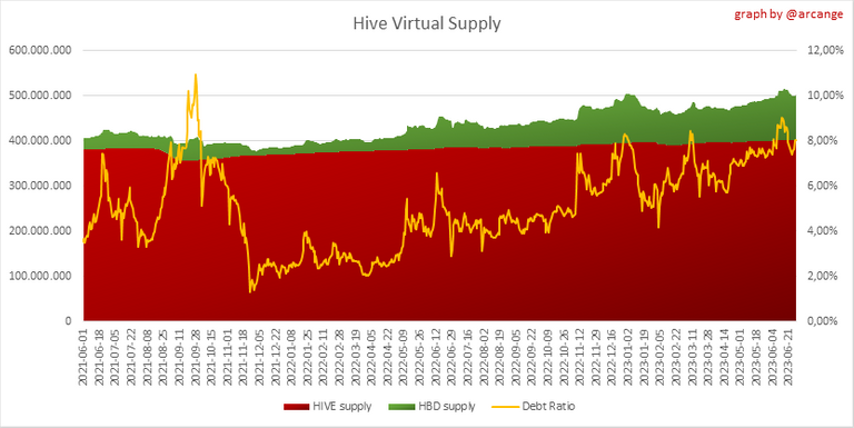 The graph also displays the debt ratio (HBD supply / HIVE virtual supply). Keep in mind that since hardfork 24 funds in the treasury (@hive.fund HBD balance) don't count towards the HBD debt ratio.