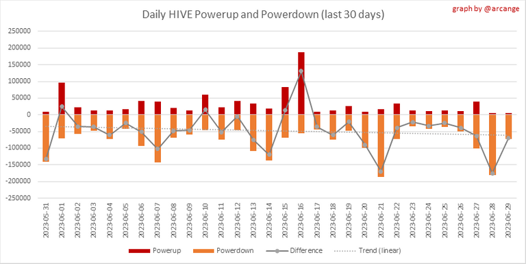 This graph shows the daily HIVE power-up, power-down, and the resulting variation over the last 30 days. The table shows the topmost power-ups and power-downs of the day.