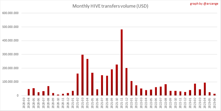 These graphs show the volume (in USD) of HIVE and HBD transferred between accounts.