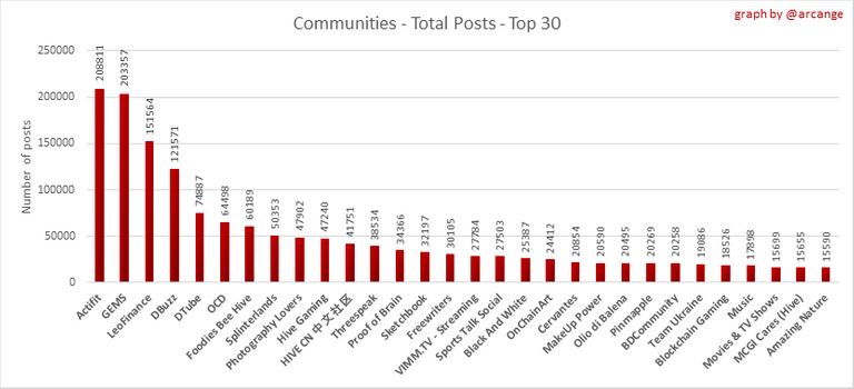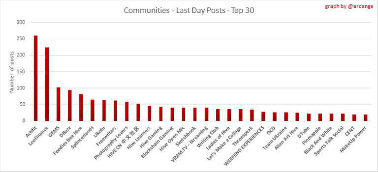 These graphs show the most active communities by number of posts (blockchain lifetime and last day).