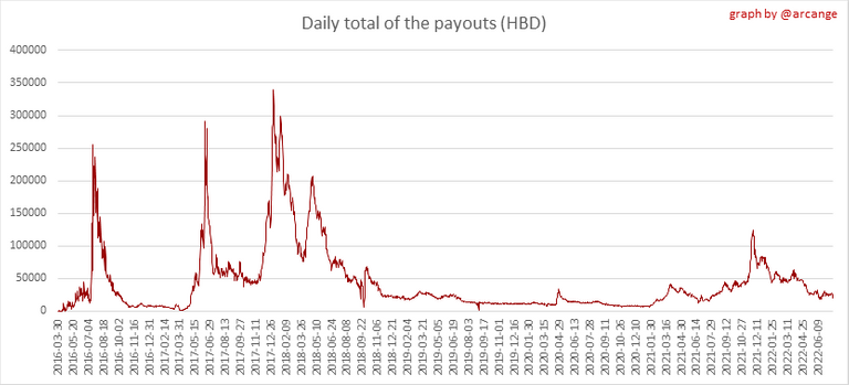 These graphs show the total of the distributed payout (posts and comments) for each day.