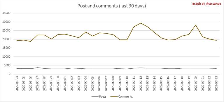 These graphs show the evolution of posts and comments for the whole blockchain lifetime and the last 30 days.