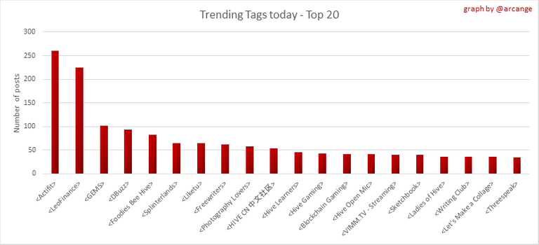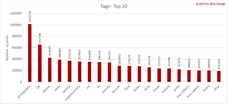 These graphs show which main tags have been the most used for publishing posts for the whole blockchain lifetime and the last day.