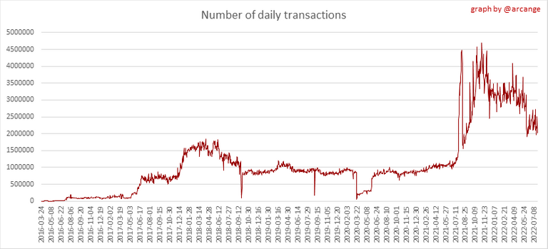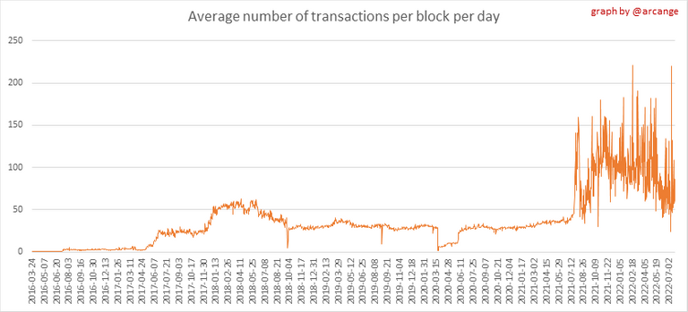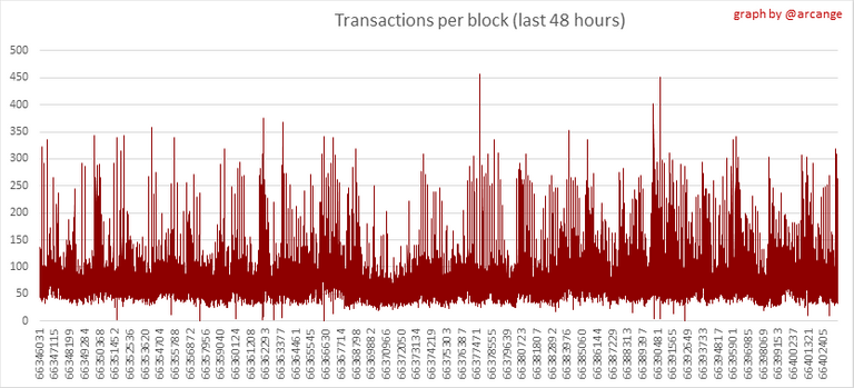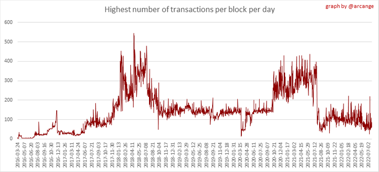 These graphs show the number of transactions per day, and the highest number of transactions per block, the average number of transactions per block, and the number of transactions per block for the last 48 hours. This gives you an idea of the whole activity on the blockchain.