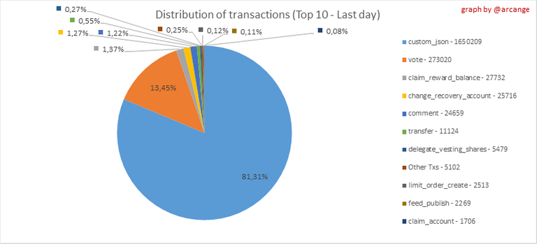 This graph shows the distribution of the top 10 types of transactions by number of operations performed on the blockchain.