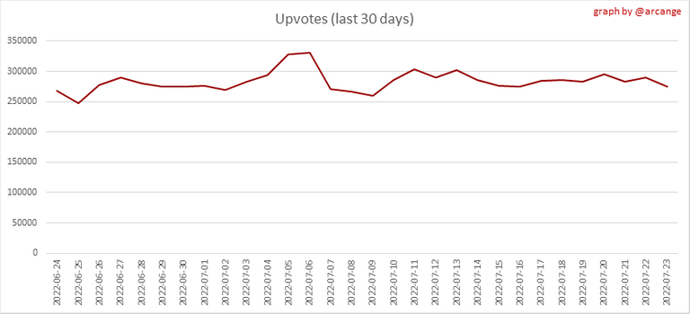 These graphs show the evolution of curation (upvotes) for the whole blockchain lifetime and the last 30 days.