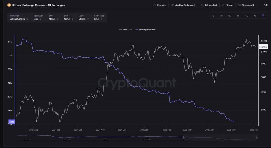 A graph with the amount of $BTC lying in “CEXes” (Centralized Exchanges, purple line) in relation to the price of Bitcoin (gray line). Over 400,000 bitcoins have been withdrawn from those entities over the last 6 months, a very encouraging trend (although a portion of them has probably been captured by ETFs).