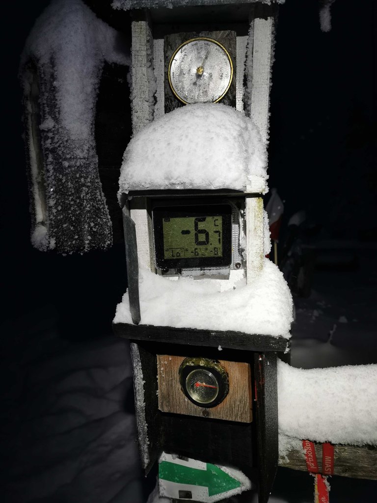 Temperatura przyzwoita - minus 7 stopni, śnieg fajnie zmrożony.... Tylko my już mocno wycieńczeni tym codziennym wchodzeniem na szczyt.
