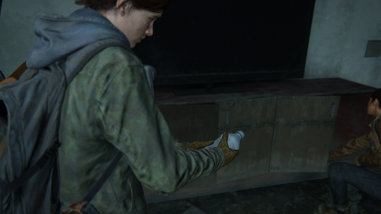 Then I found an alcohol bottle, and Dina found a couple of rags. She gave it to Ellie to patch herself up, as she was attacked earlier by the infected. I used them to craft a medicine kit and then I used the medicine kit and healed myself.