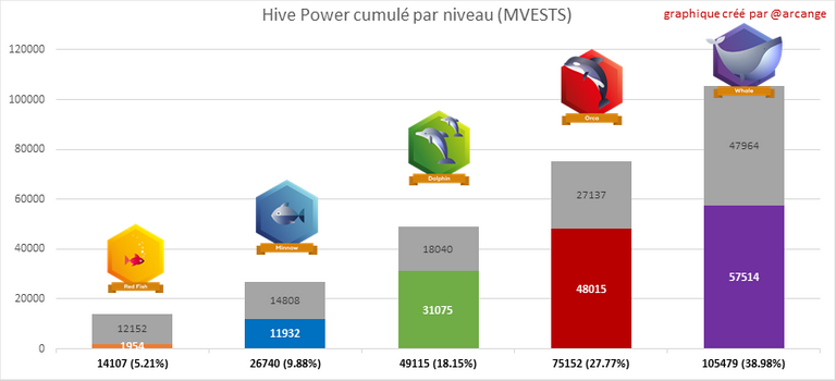 Ce graphique montre la distribution de Hive Power cumulée par niveau de compte. Le graphique de gauche montre la répartition sans tenir compte des délégations données ou reçues. Le graphique de droite prend en compte la délégation en additionant les délégations reçues et en soustrayant les délégations données.