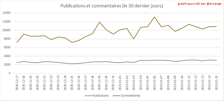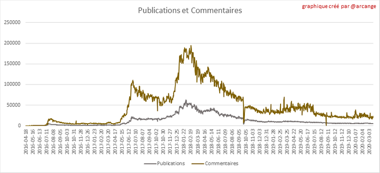 Ces graphiques montrent l'évolution des publications et des commentaires pour toute la durée de vie de la blockchain et pour les 30 derniers jours.