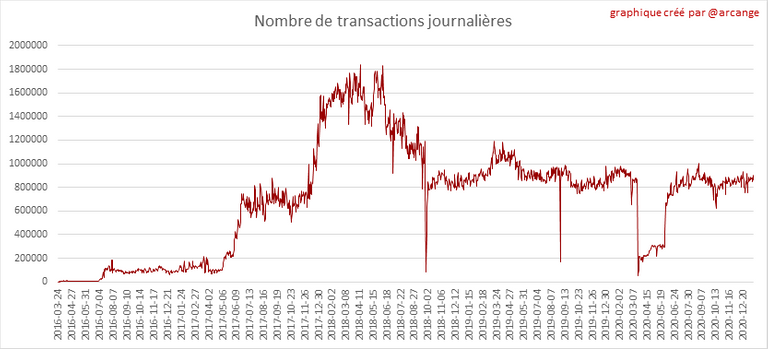 Ce graphique montre le nombre d'utilisateurs nouvellement inscrits sur la blockchain et combien d'entre eux sont devenus actifs. Nous voyons que beaucoup de comptes sont enregistrés, mais jamais utilisés. Ce graphique est un peu dynamique! Un utilisateur peut s'inscrire un jour et ne devenir actif que quelques jours plus tard. Par conséquent, le nombre d'utilisateurs actifs à une date donnée peut varier d'un jour à l'autre.