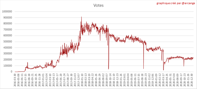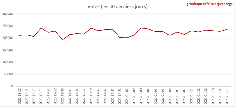 Ces graphiques montrent l'évolution de la curation (votes positifs) depuis la création de la blockchain et pour les 30 derniers jours.